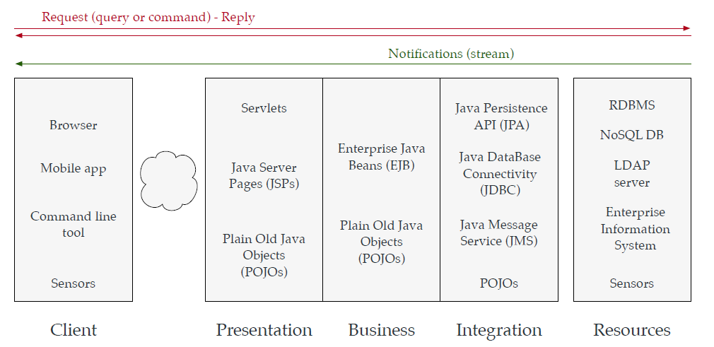 👉🏼 Les tiers présentation, business, intégration et ressources sont souvent connectés par le même réseau. (les appels de intégration et ressources sont en remote, mais cela coûte tjr moins cher que de faire passer des appels par internet.)