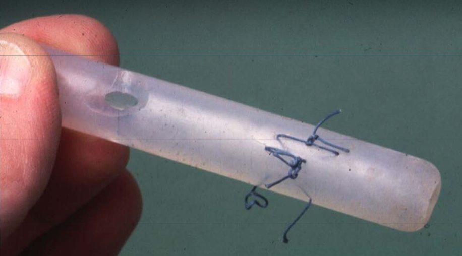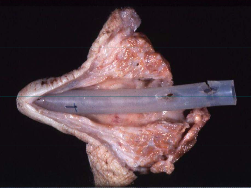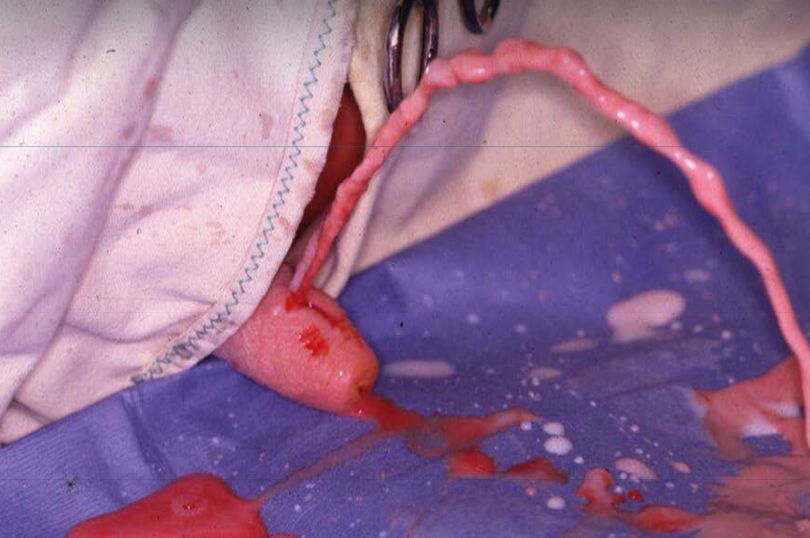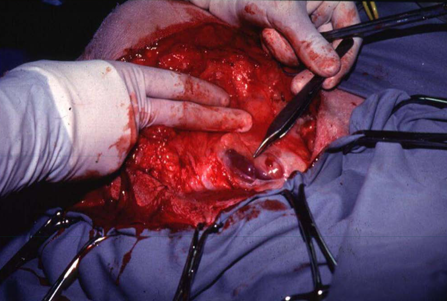largest vessels, use large suture (you can use umbilical tape) and double ligate (circumferential); if cut, there is really nothing you can do, animal bleeds to death (1.5 cm in diameter)