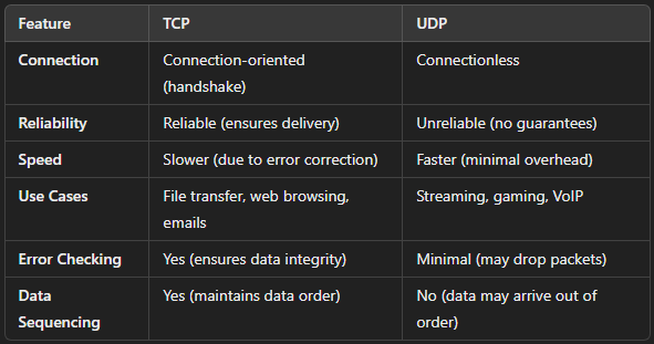 - Web Browsing: HTTP/HTTPS relies on TCP for reliable page loading.