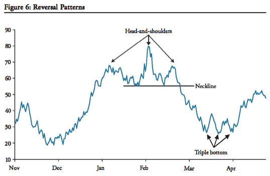 HEAD AND SHOULDERS is an example. If prices fall below the neckline after the second shoulder then they ‘should’ continue to fall by the height of the HAS pattern.