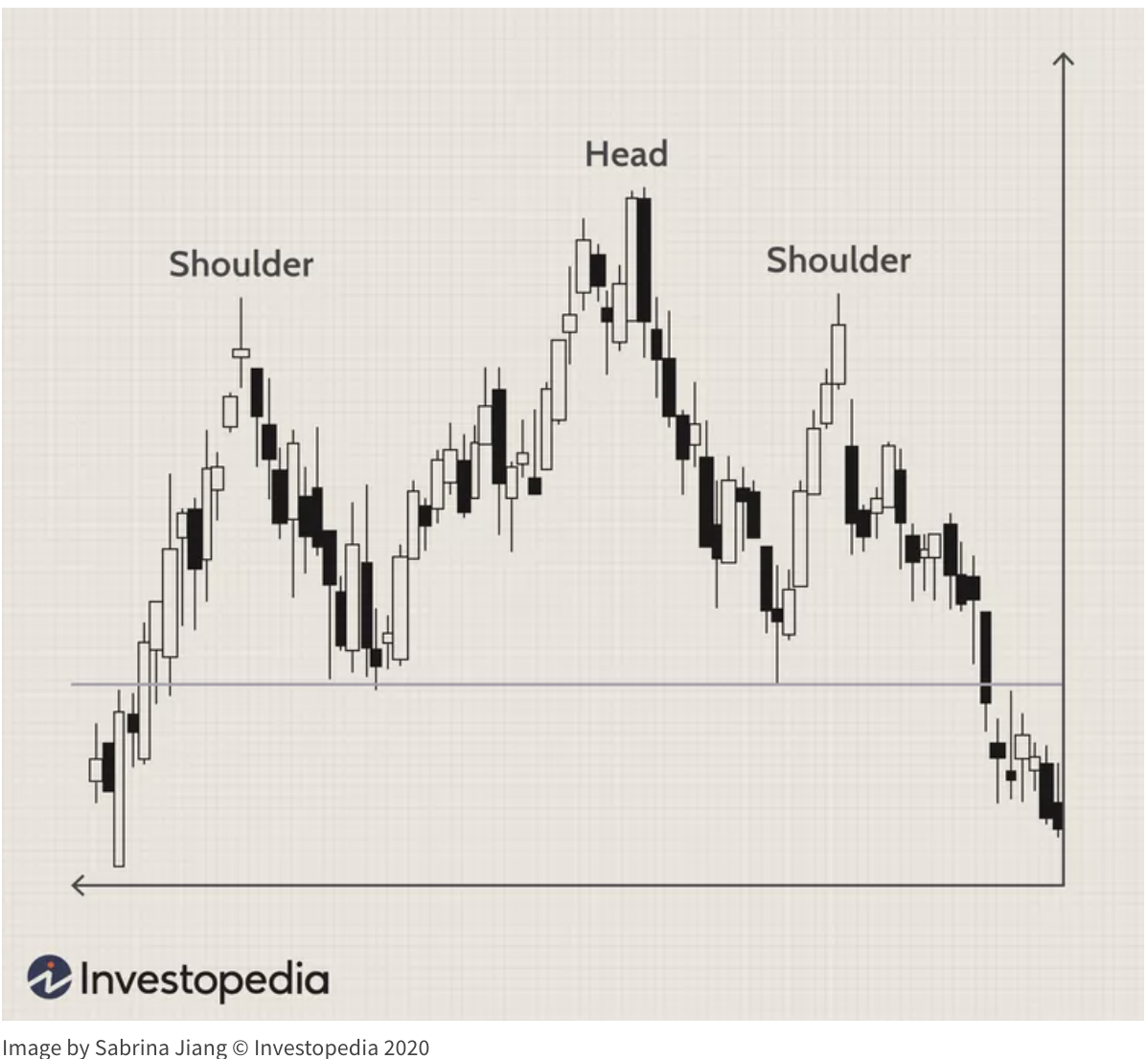 A chart pattern indicating trend reversal, characterized by a peak (shoulder), followed by a higher peak (head), and another lower peak (shoulder).