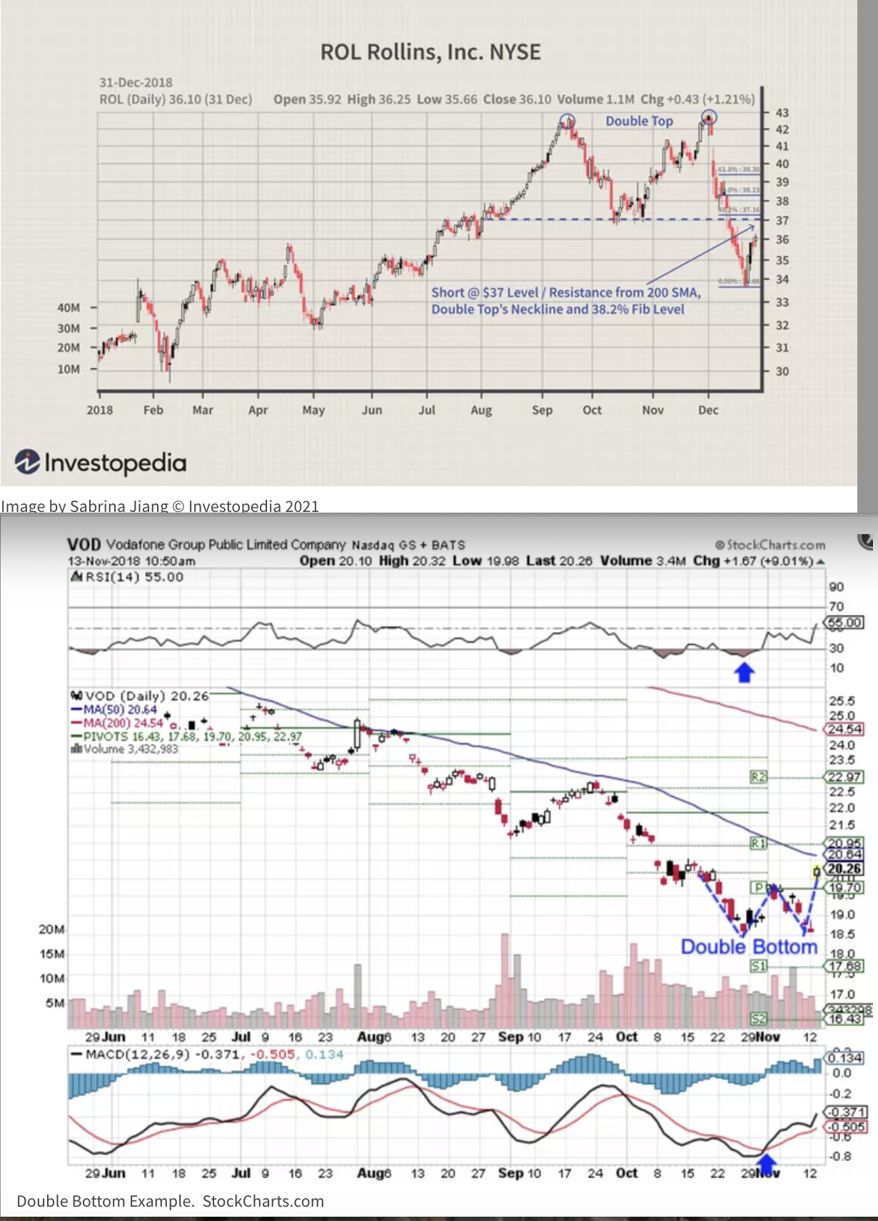 Patterns suggesting trend reversal; Double Top appears at market top, Double Bottom at market bottom.