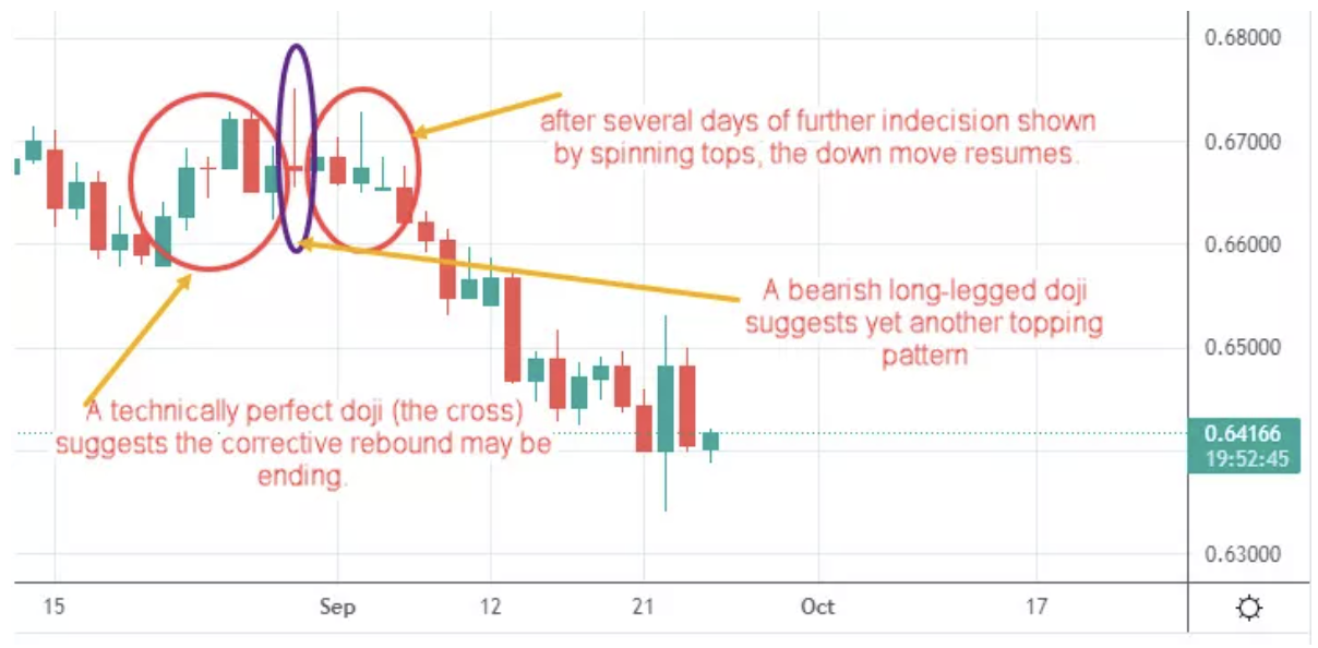 A doji (plural is also doji) is a candlestick formation where the open and close are identical, or nearly so. A spinning top is very similar to a doji, but with a very small body, in which the open and close are nearly identical.