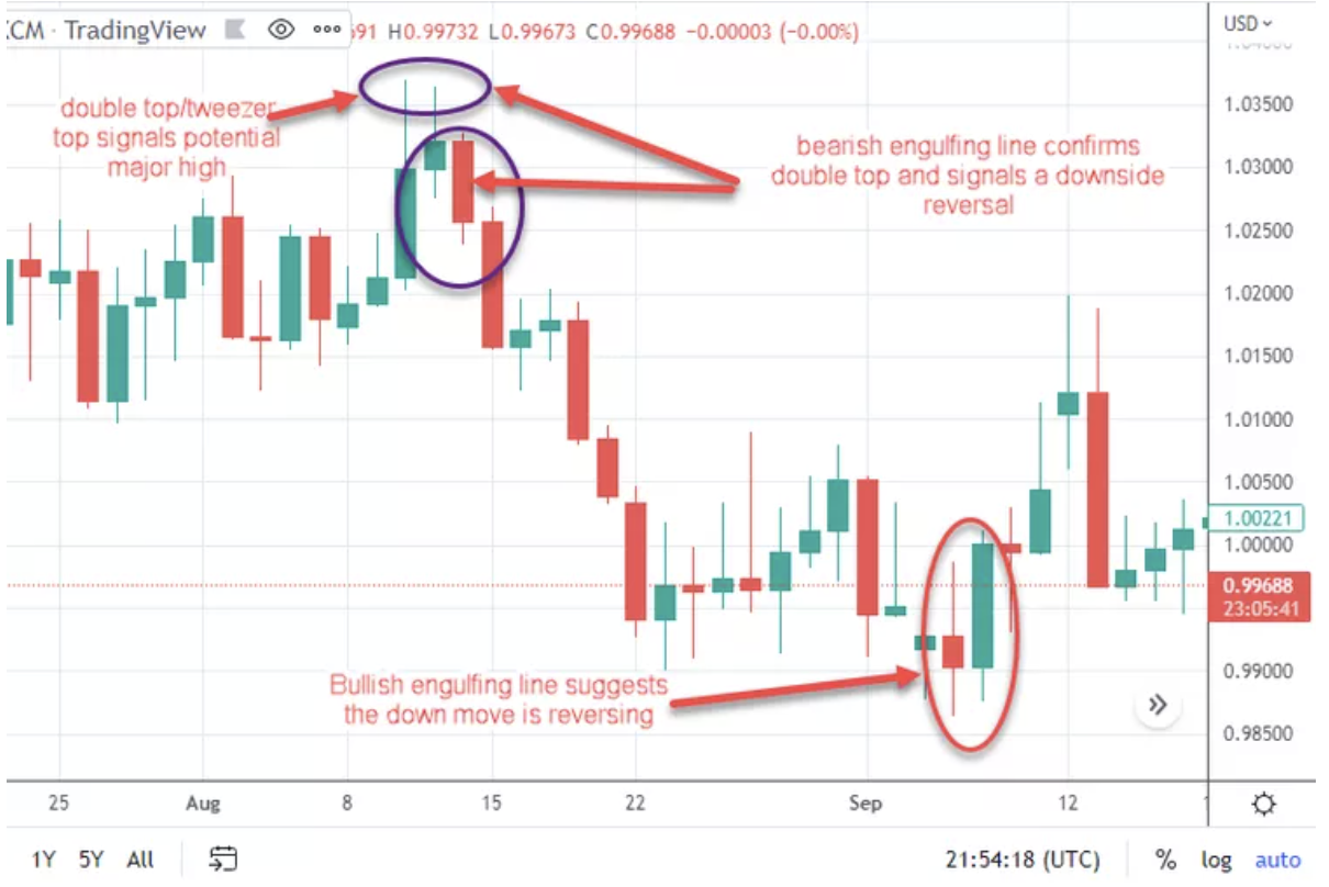 A bullish engulfing line is the corollary pattern to a bearish engulfing line, and it appears after a downtrend. Also, a double bottom, or tweezers bottom, is the corollary formation that suggests a downtrend may be ending and set to reverse higher.