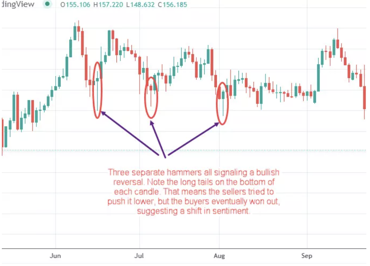 A hammer suggests that a down move is ending (hammering out a bottom). Note the long lower tail, which indicates that sellers made another attempt lower, but were rebuffed and the price erased most or all of the losses on the day. The important interpretation is that this is the first time buyers have surfaced in strength in the current down move, which is suggestive of a change in directional sentiment. The pattern is confirmed by a bullish candle the next day.
