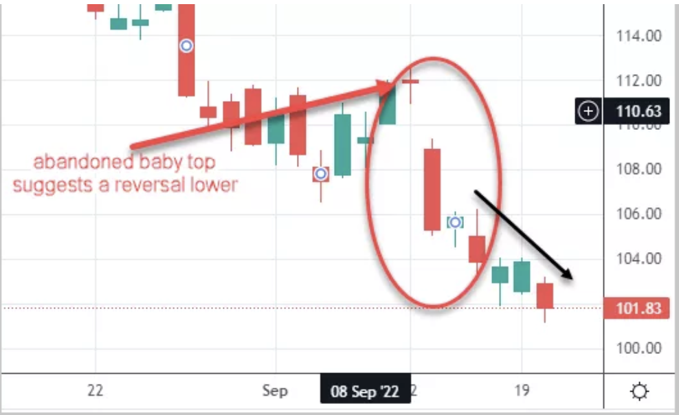 An abandoned baby, also called an island reversal, is a significant pattern suggesting a major reversal in the prior directional movement. An abandoned baby top forms after an up move, while an abandoned baby bottom forms after a downtrend.