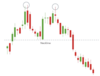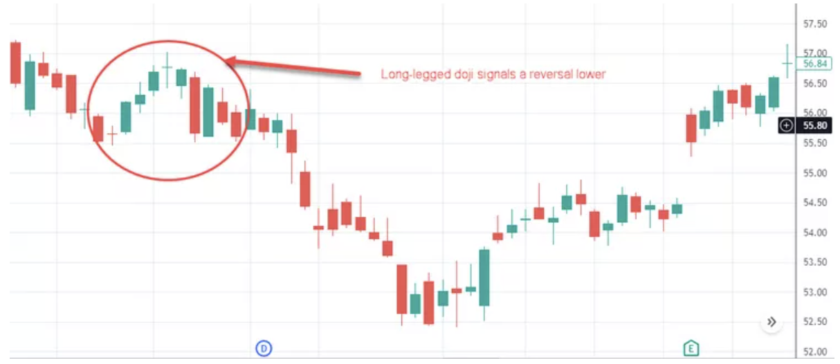 Another key candlestick signal to watch out for are long tails, especially when they’re combined with small bodies. Long tails represent an unsuccessful effort of buyers or sellers to push the price in their favored direction, only to fail and have the price return to near the open. Just such a pattern is the doji shown below, which signifies an attempt to move higher and lower, only to finish out with no change. This comes after a move higher, suggesting that the next move will be lower.
