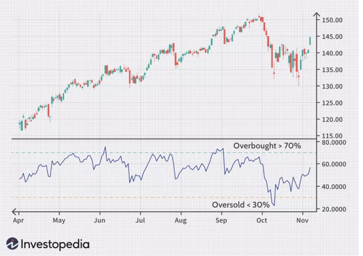 A momentum oscillator measuring speed and change of price movements; above 70 is overbought, below 30 is oversold.