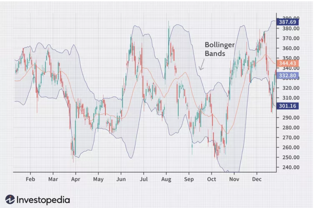 A volatility indicator that consists of a middle SMA along with upper and lower bands that adjust based on market volatility. They can signal overbought or oversold conditions.