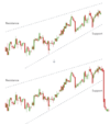 Key price levels where a stock/market seldom falls below (support) or surpasses (resistance).