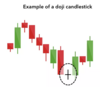 Candlesticks that have a small body—a doji, for example—indicate that the buyers and sellers fought to a draw, leaving the close nearly exactly at the open. (Such a candlestick could also have a very small body, effectively forming a spinning top.) Small bodies represent indecision in the marketplace over the current direction of the market.