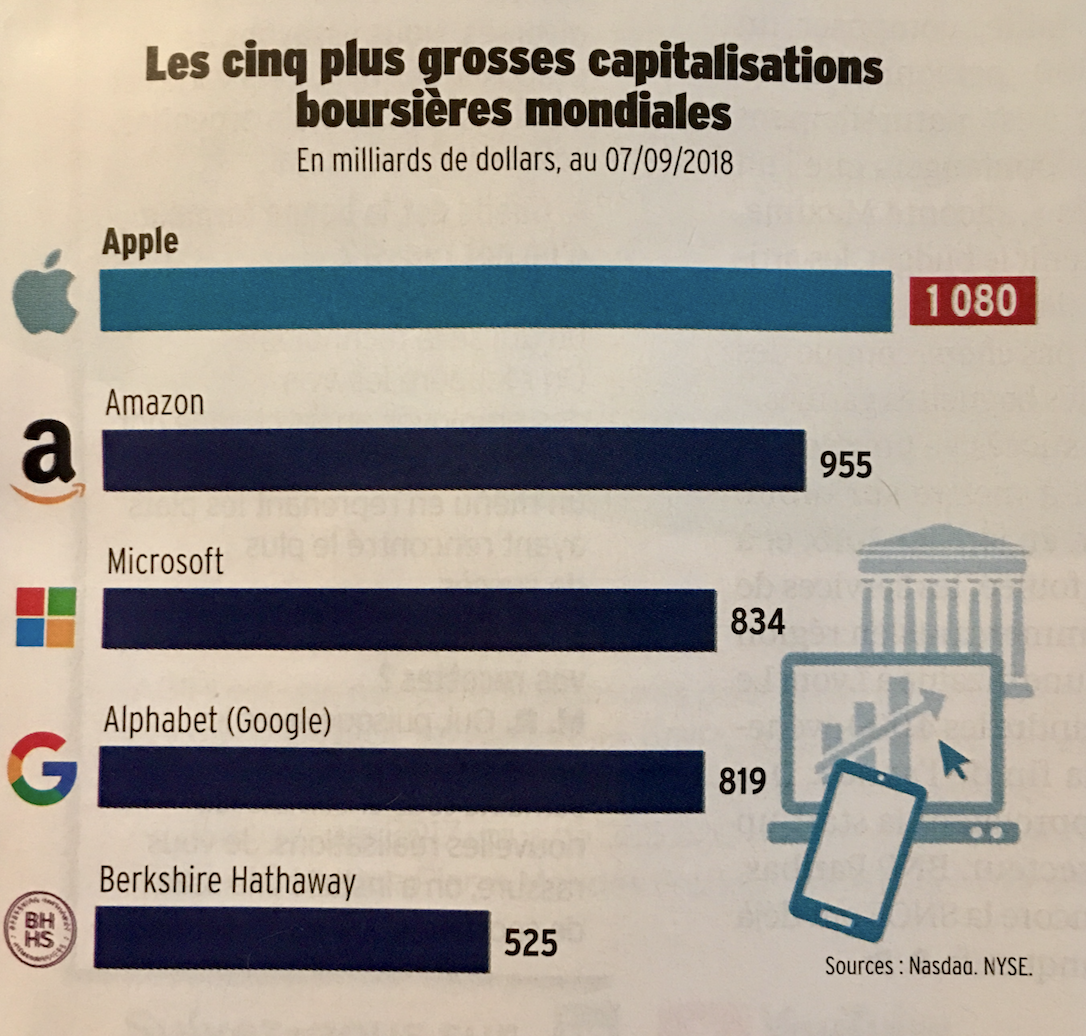 Les cinq plus grandes entreprises technologiques américaines (Google, Amazon, Facebook, Apple et Microsoft) ont symboliquement surclassé en valorisation le PIB de l’Allemagne (3ème économie mondiale).