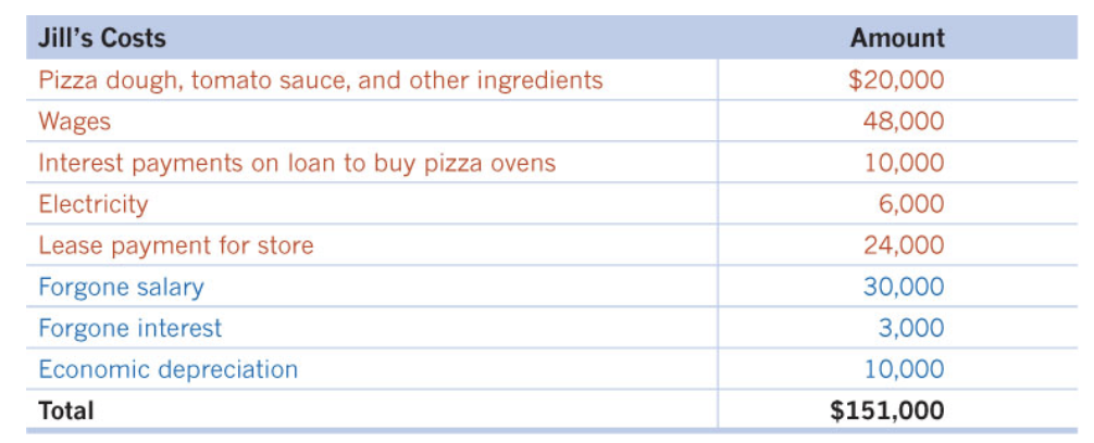 implicit costs: her foregone salary, the interest the money could have earned