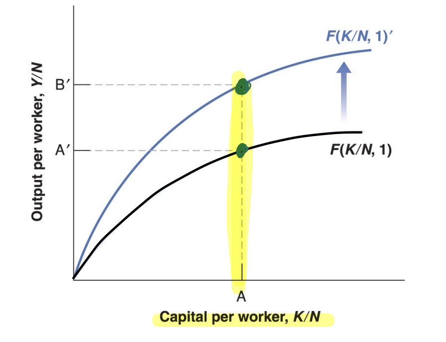 The production function pivots outwards, leading to an increase in output per worker for every given level of capital per worker