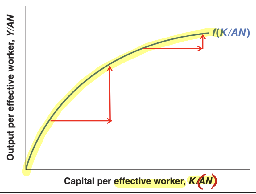 Because of decreasing returns to capital, increases in capital per effective worker lead to smaller and smaller increases in output per effective worker