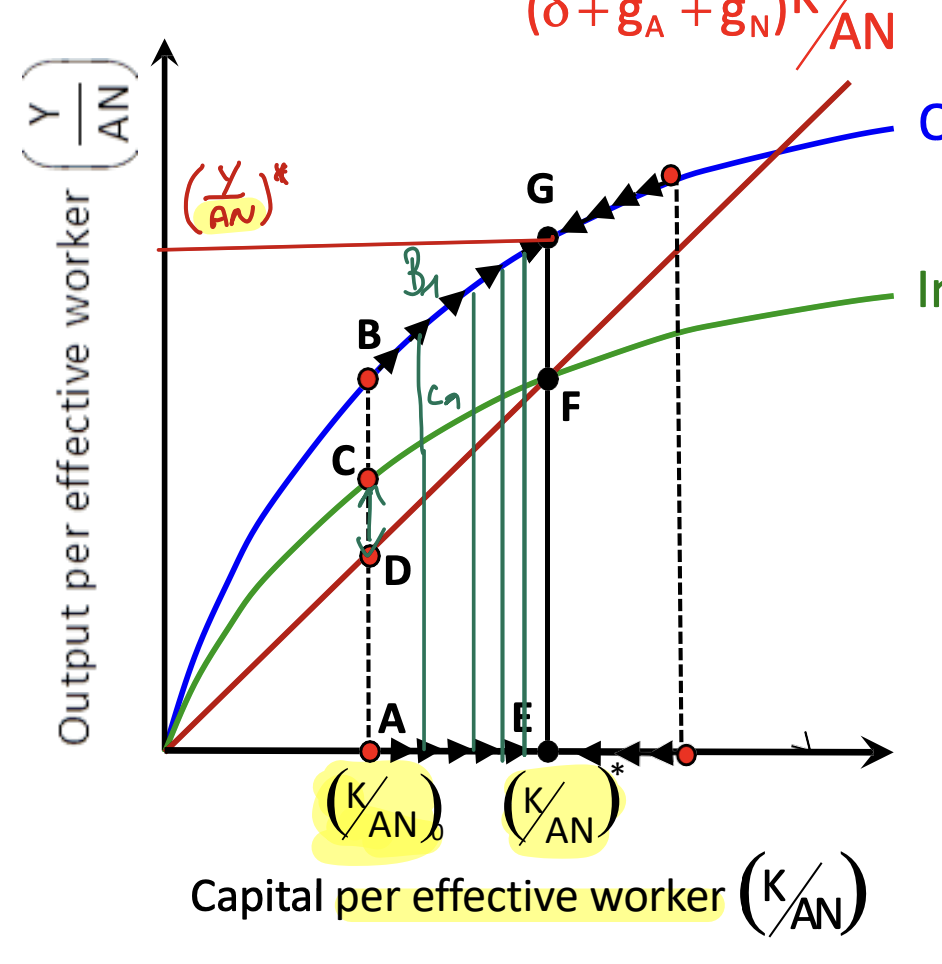-In the long run K/AN reaches the steady state, (K/AN)* at point E and output per effective worker is (Y/AN) = AG