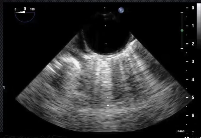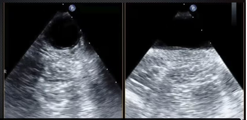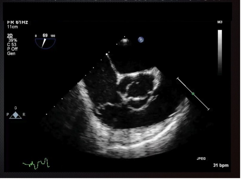 Trans-gastric mid-papillary short axis view - start at ME 4CH view at 0 on the multiplane, advance probe to stomach and then anteflex. Manipulate probe depth until you can see posteromedial and anterolateral papillary muscles. See right and left ventricles. Good for regional wall movement abnormalities. Good for volume assessment.
