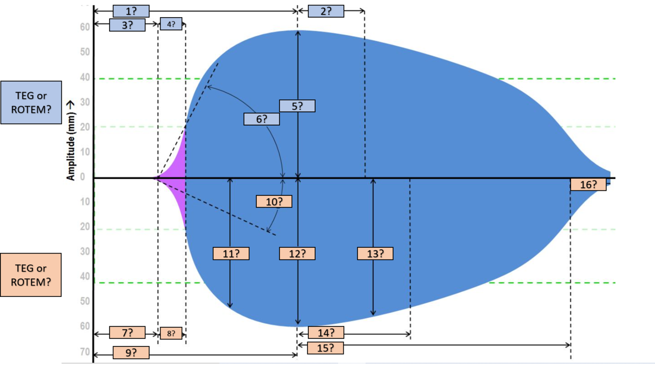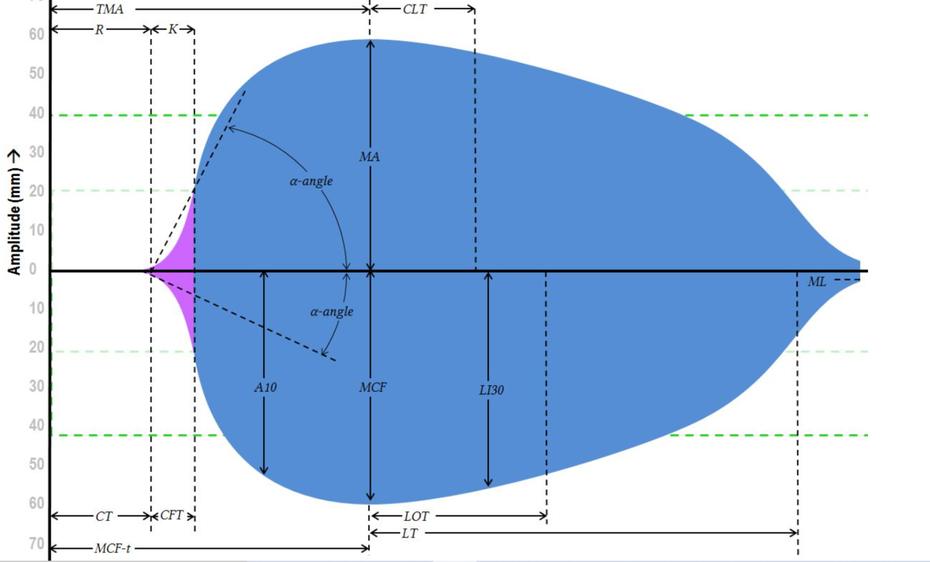 Time to maximum amplitude (TMA in TEG or MCF-t in ROTEM) refer to the time it takes to reach MCF or MA.