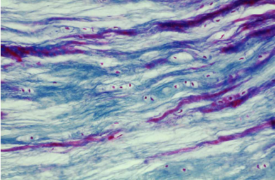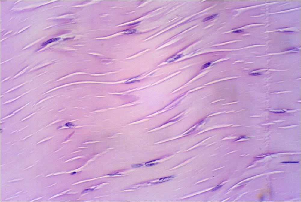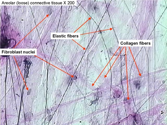 (Fibroblast nuclei, collagen fibers woven, elastic fibers occupy free space)