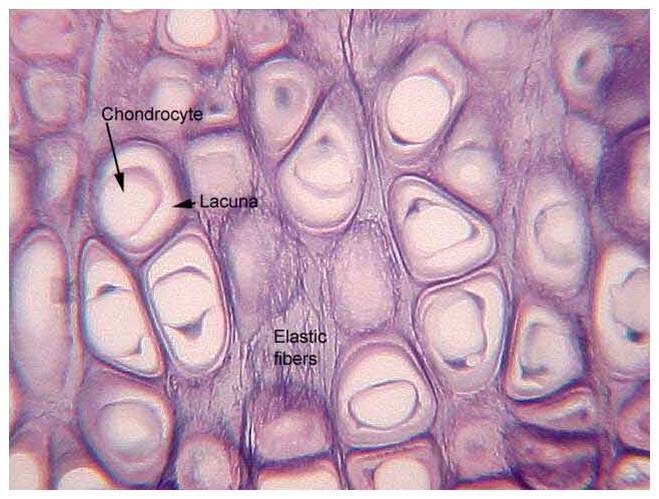 (Chondrocytes in lacuna, matrix with elastic fibers)