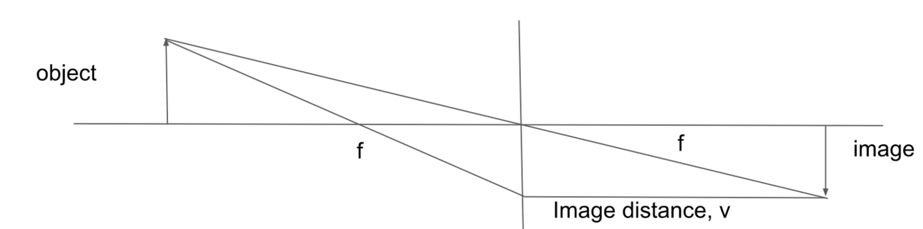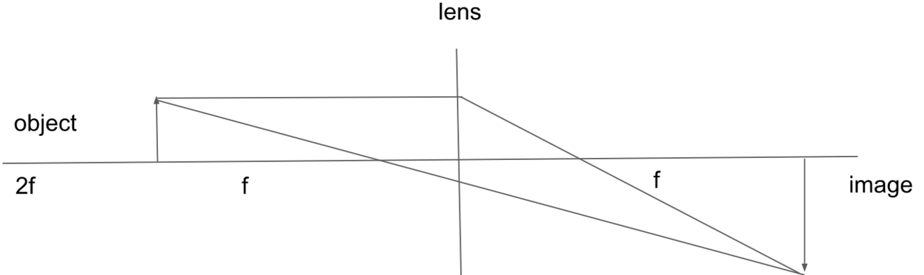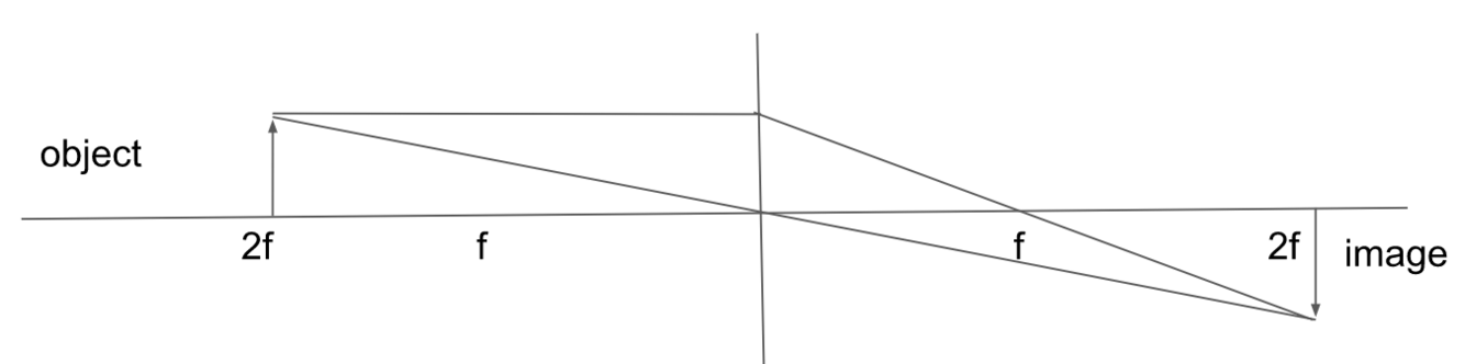 Describe the ray diagram of an image that is exactly 2F from the lens and describe the image’s apperence