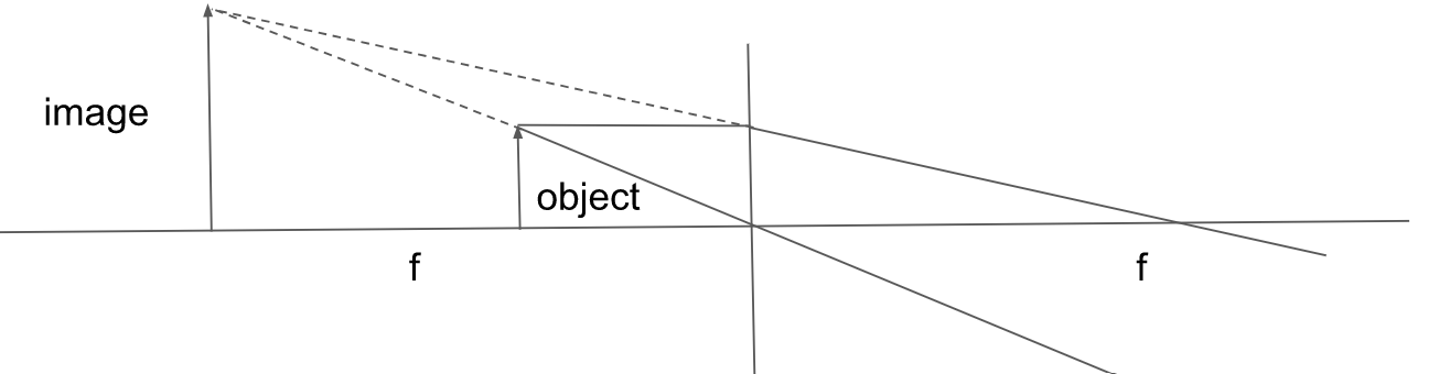 Describe the ray diagram of an image that is fairly close to the lens (between 2F and F) and describe the image’s apperence