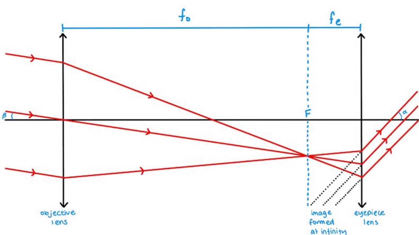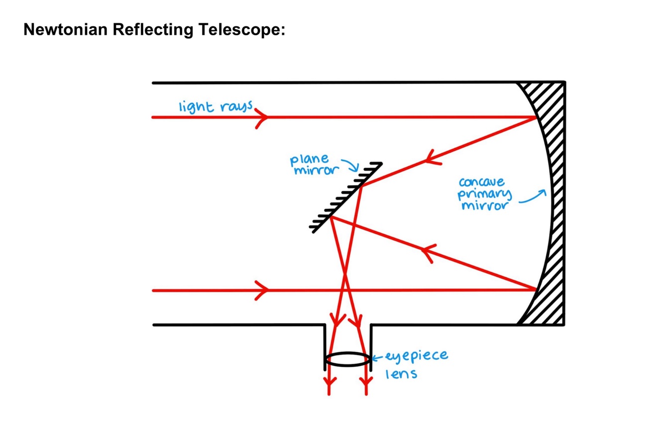 Light is collected and focused on to an eyepiece lens, using a plane mirror