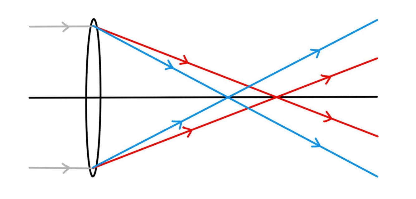 – focal length of red light is greater than blue, meaning they focus on different points.