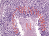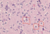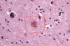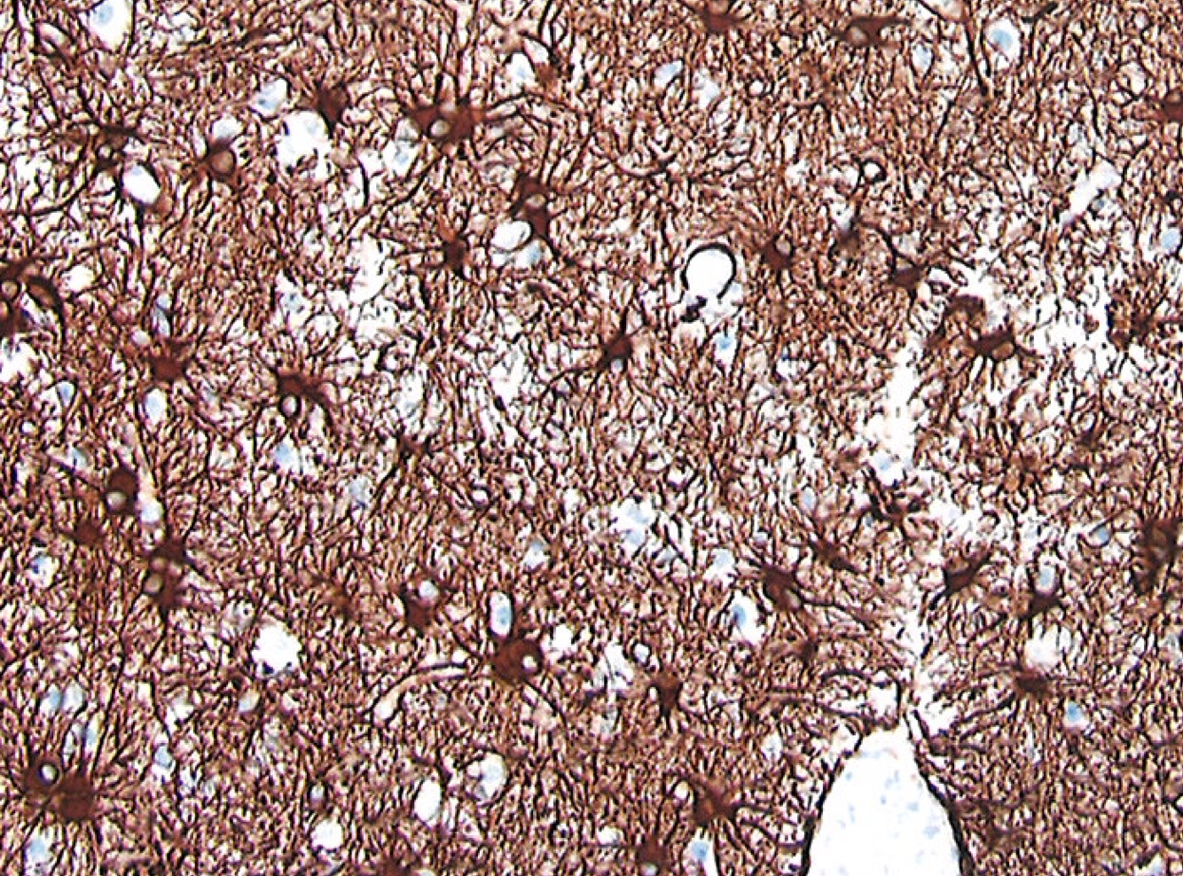 Figura 28. 1 Astrocitos reactivos. La tinción inmunohistoquímica para la proteína gliofibrilar ácida (morrón) pone de relieve las prolongaciones astrocíticas estrelladas que dan nombre a estas células.