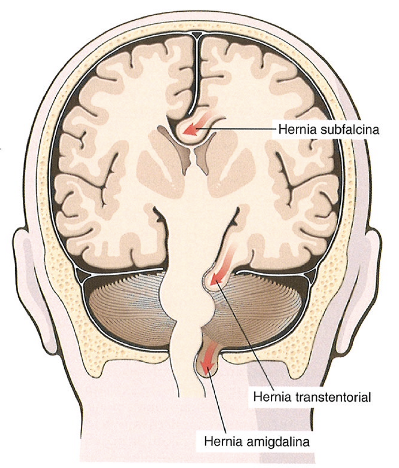 Es un desplazamiento de tejido cerebral más allá de los pliegues durales rígidos (la hoz y la tienda) o a través de aberturas en el cráneo por hipertensión intracraneal.