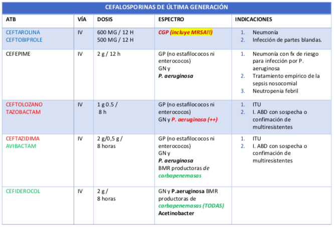 Tabla de cefalosporinas de última generación