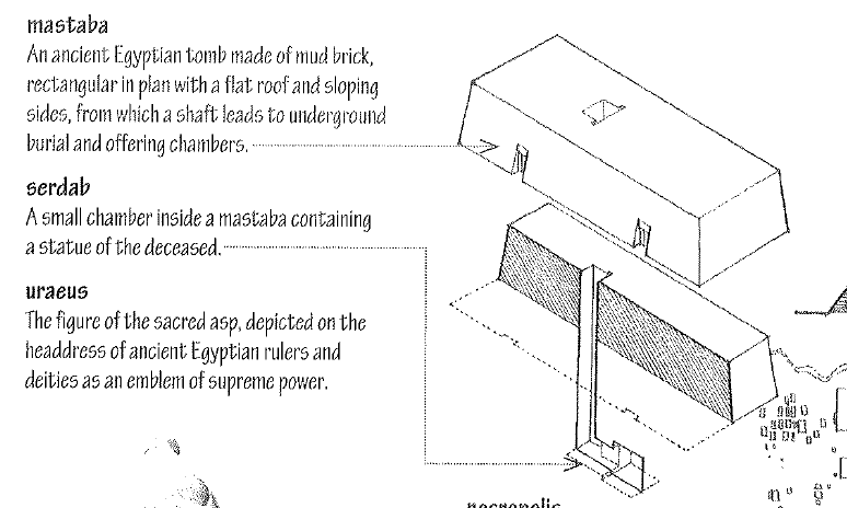 An ancient Egyptian tomb made of mud brick, rectangular in plan with a flat roof and sloping sides, from which a shaft leads to underground.
