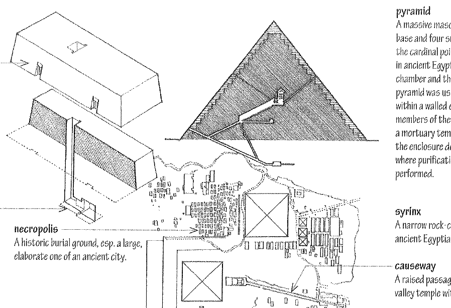 A massive masonry structure having a rectangular base and four smooth, steeply sloping sides facing the cardinal points and meeting at an apex, used in ancient Egypt as a tomb to contain the burial chamber and the mummy of the pharaoh. The pyramid was usually part of a complex of buildings within a walled enclosure, including mastabas for members of the royal family, an offering chapel and a mortuary temple. A raised causeway led from the enclosure down to a valley temple on the Nile, where purification rites and mummification were performed.