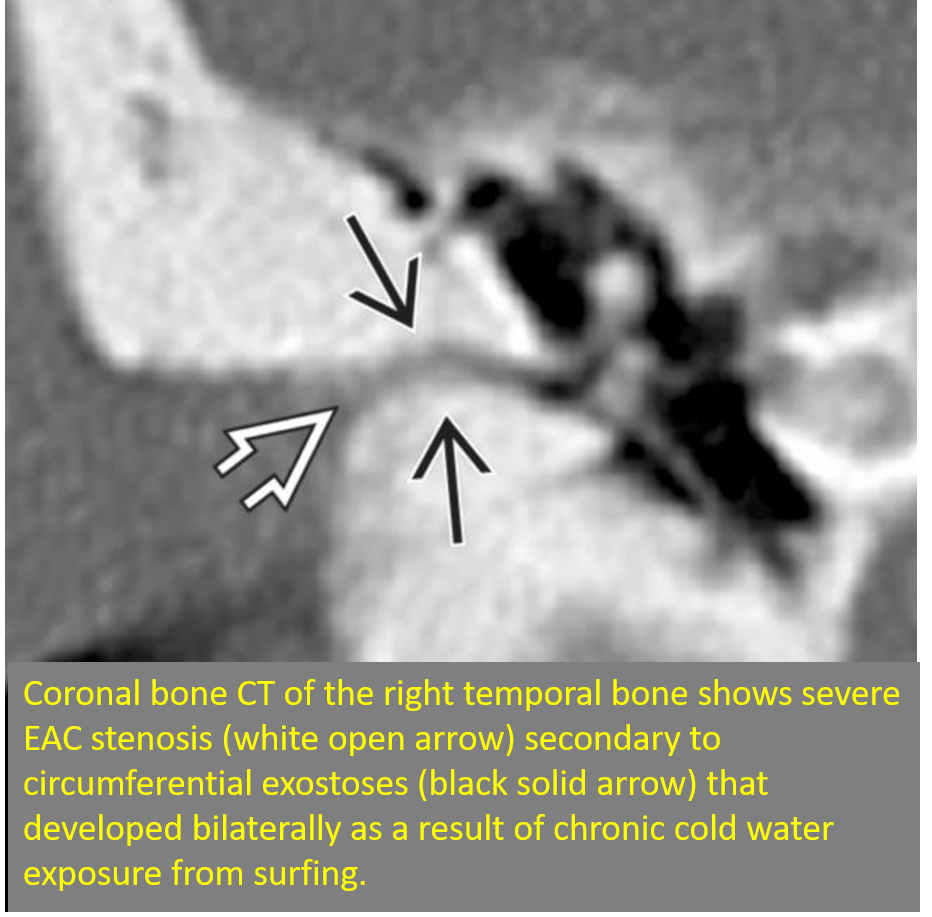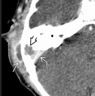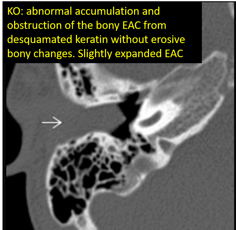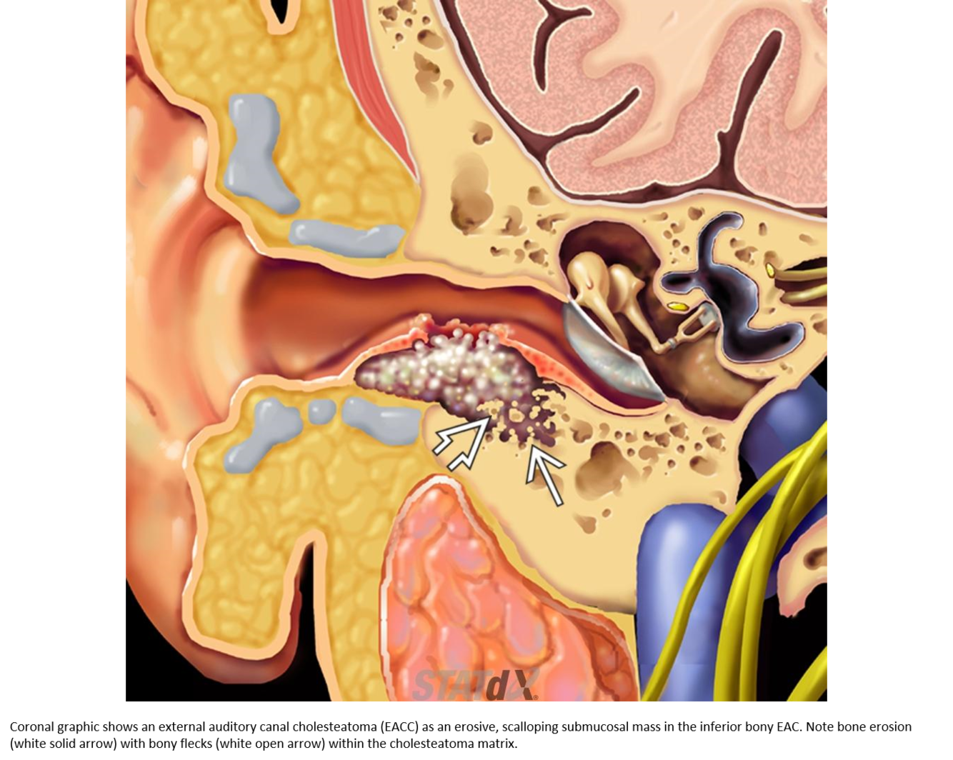 Classic inferior EAC osseous destruction and inflammatory tissue within the medial EAC.