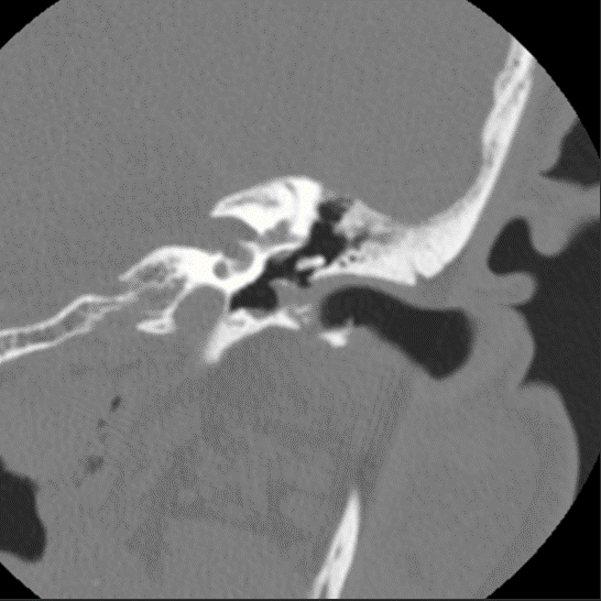 Medial epitympanic congenital cholesteatoma that erodes portions of the ossicles.