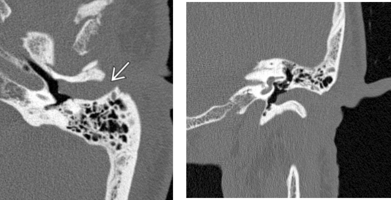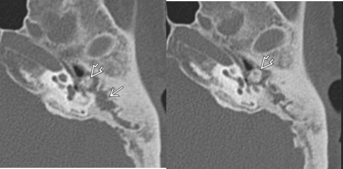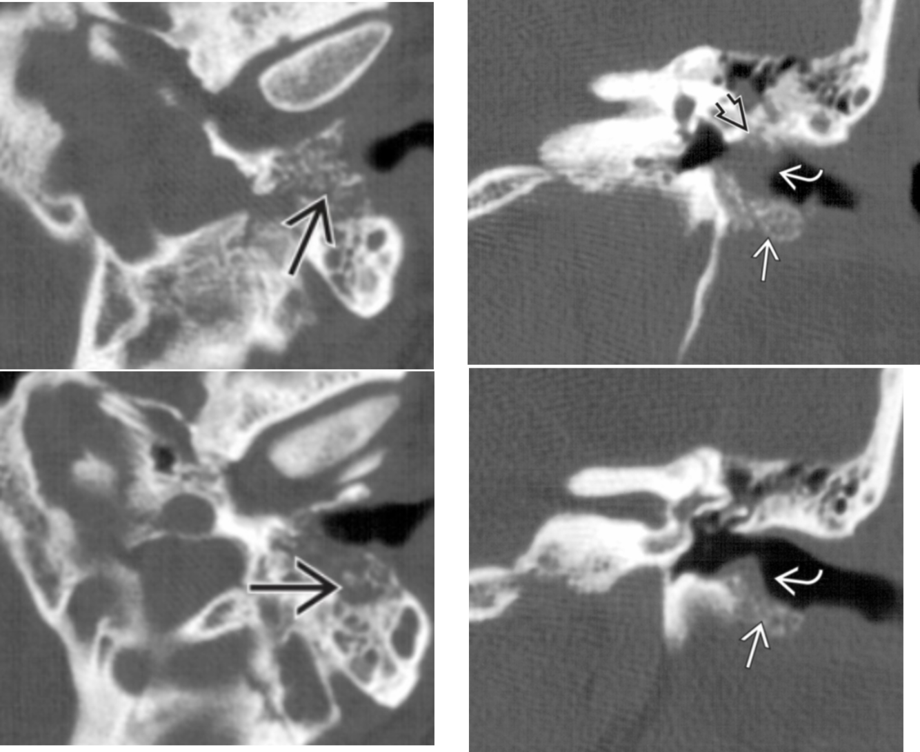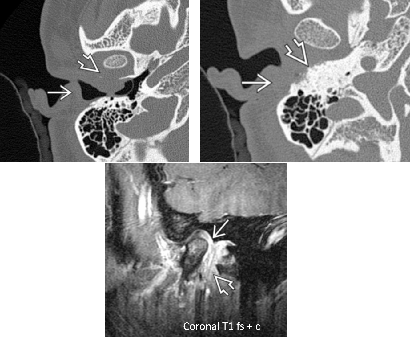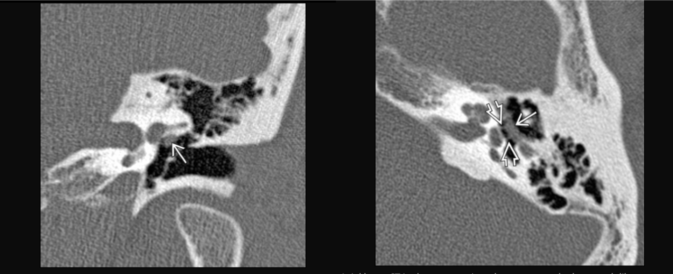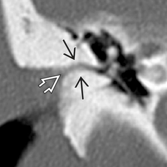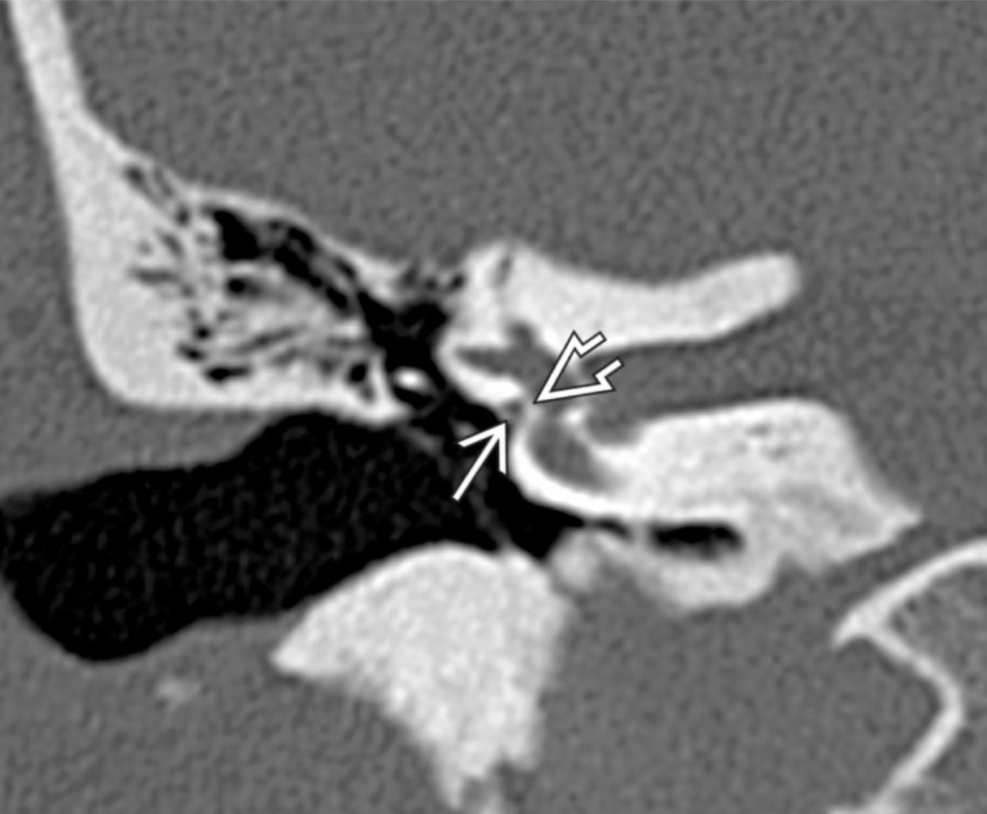 open arrow: erosion of the long process of the incus and hub of the stapes