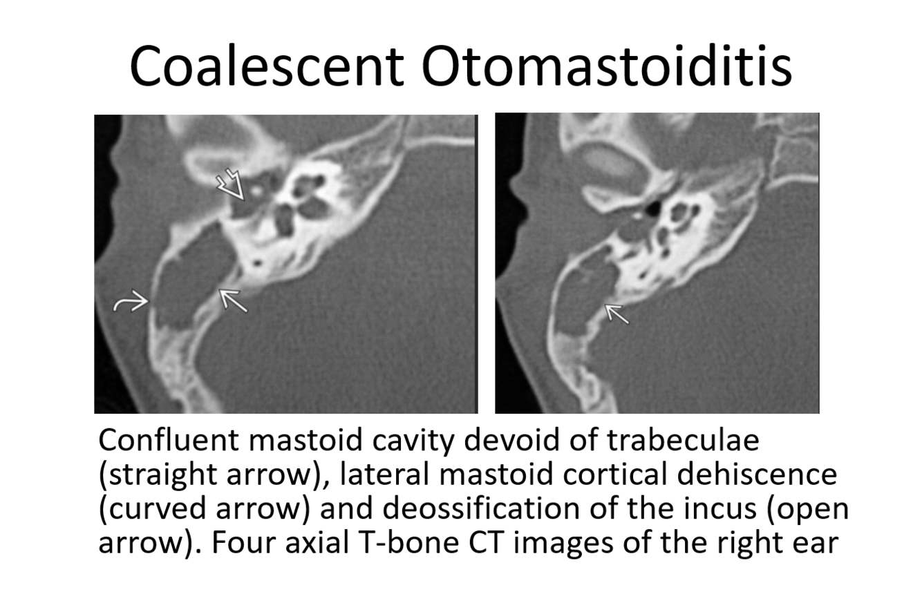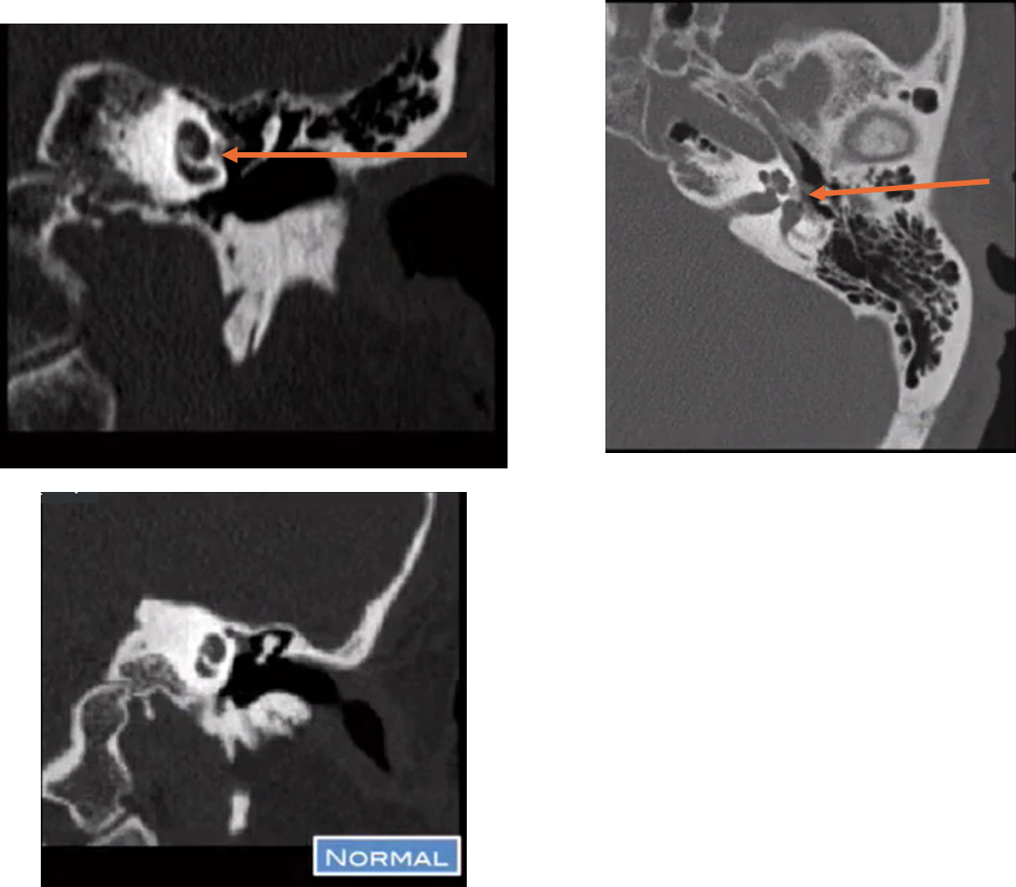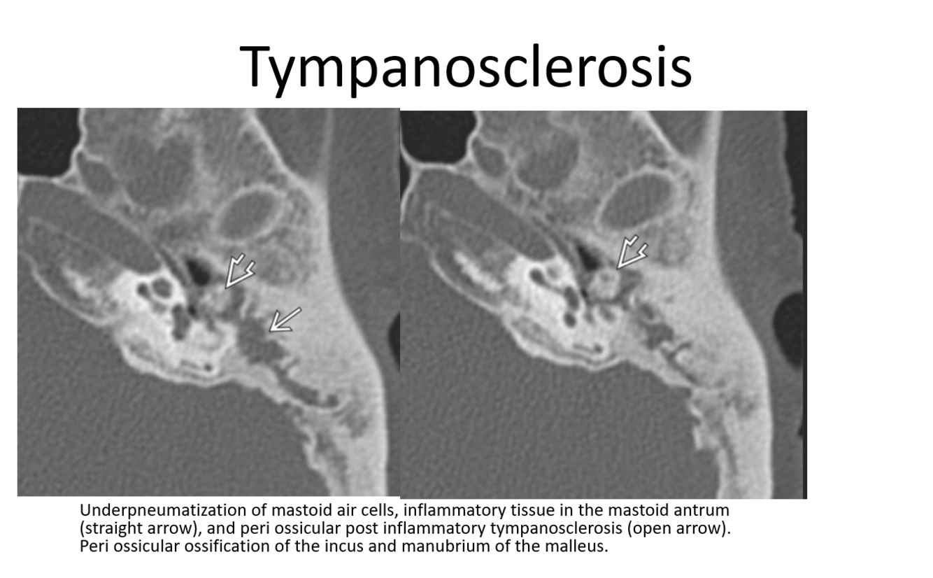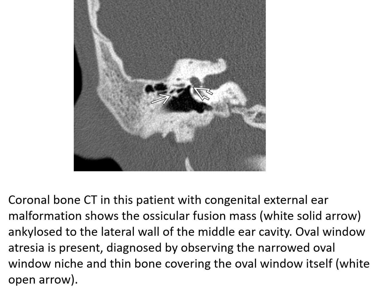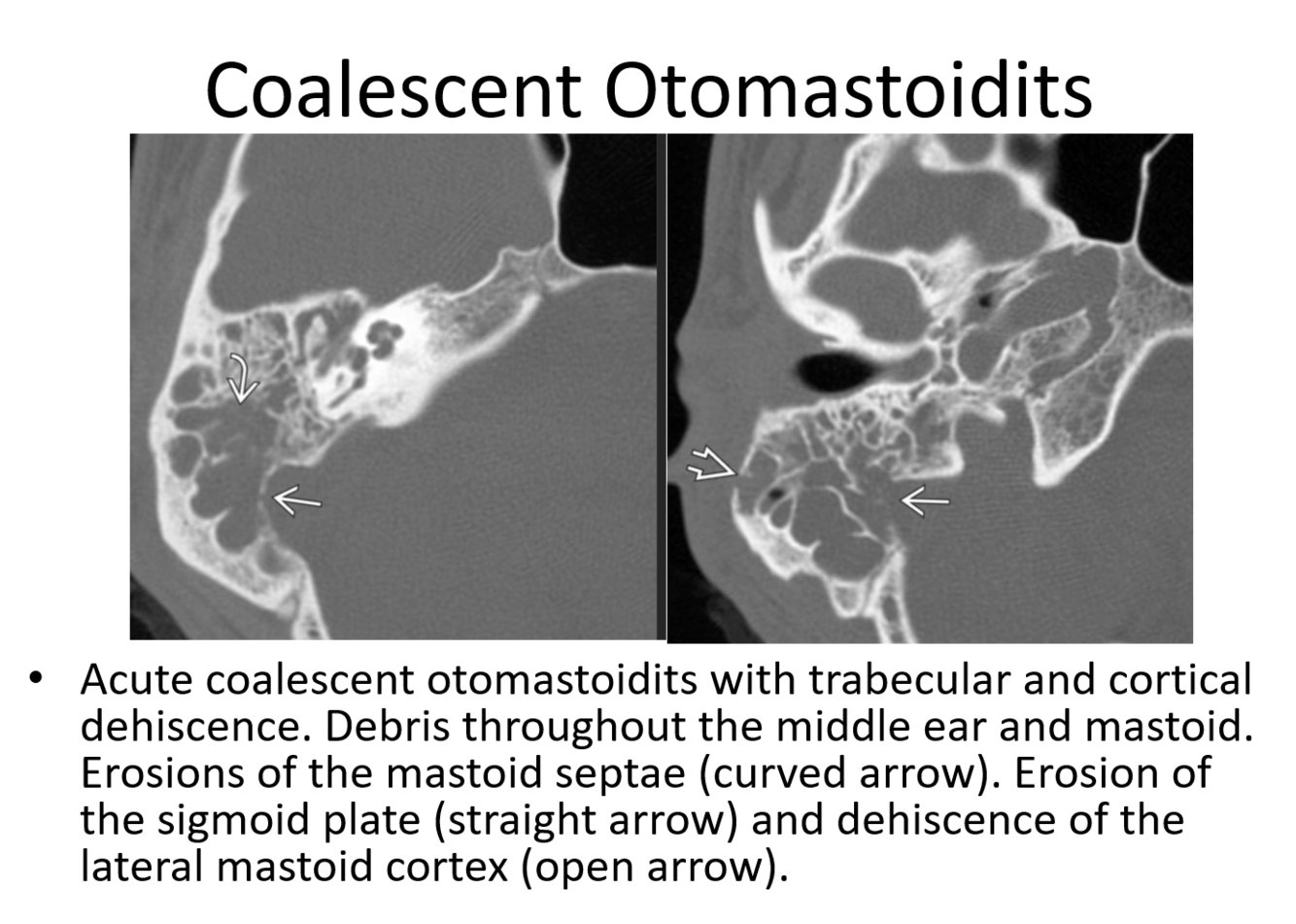 open arrow: erosion of the long process of the incus and hub of the stapes