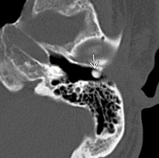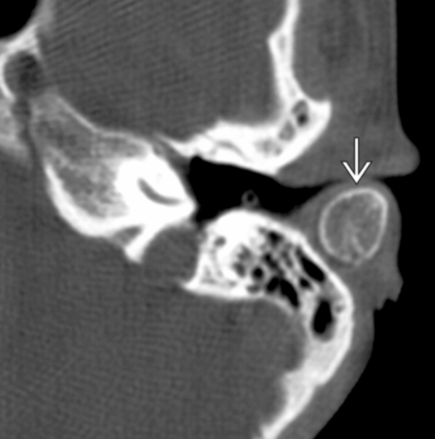 Axial bone CT shows an ovoid bone with cortex and marrow space in the location of the posterior portion of the cartilaginous EAC. No stalk of attachment is visible. Accessory ossicles are rare in this area.
