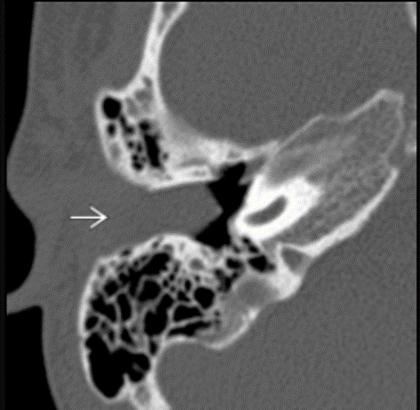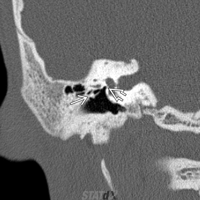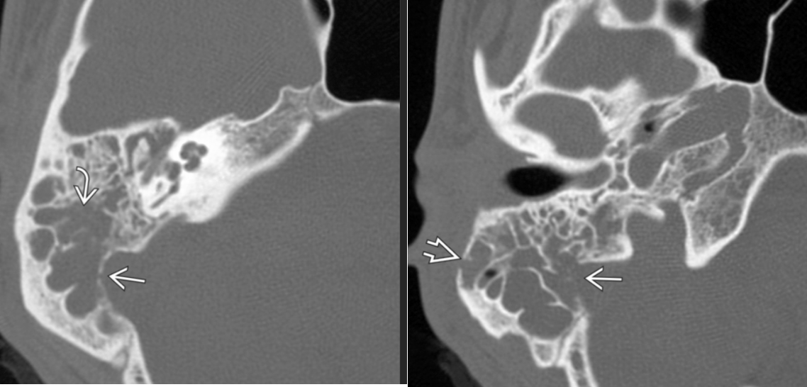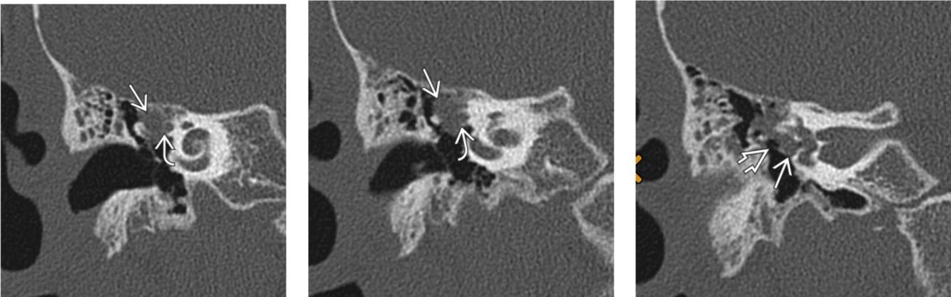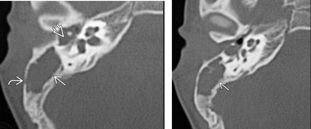 Curved arrow: erosion of the lateral bony margin of the tympanic segment of the facial nerve canal