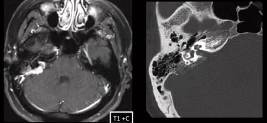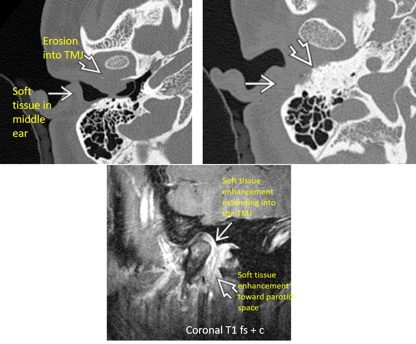 axial bone algorithm CT shows soft tissue density in the EAC with osseous erosion. MR demostrates soft tissue enhancement.
