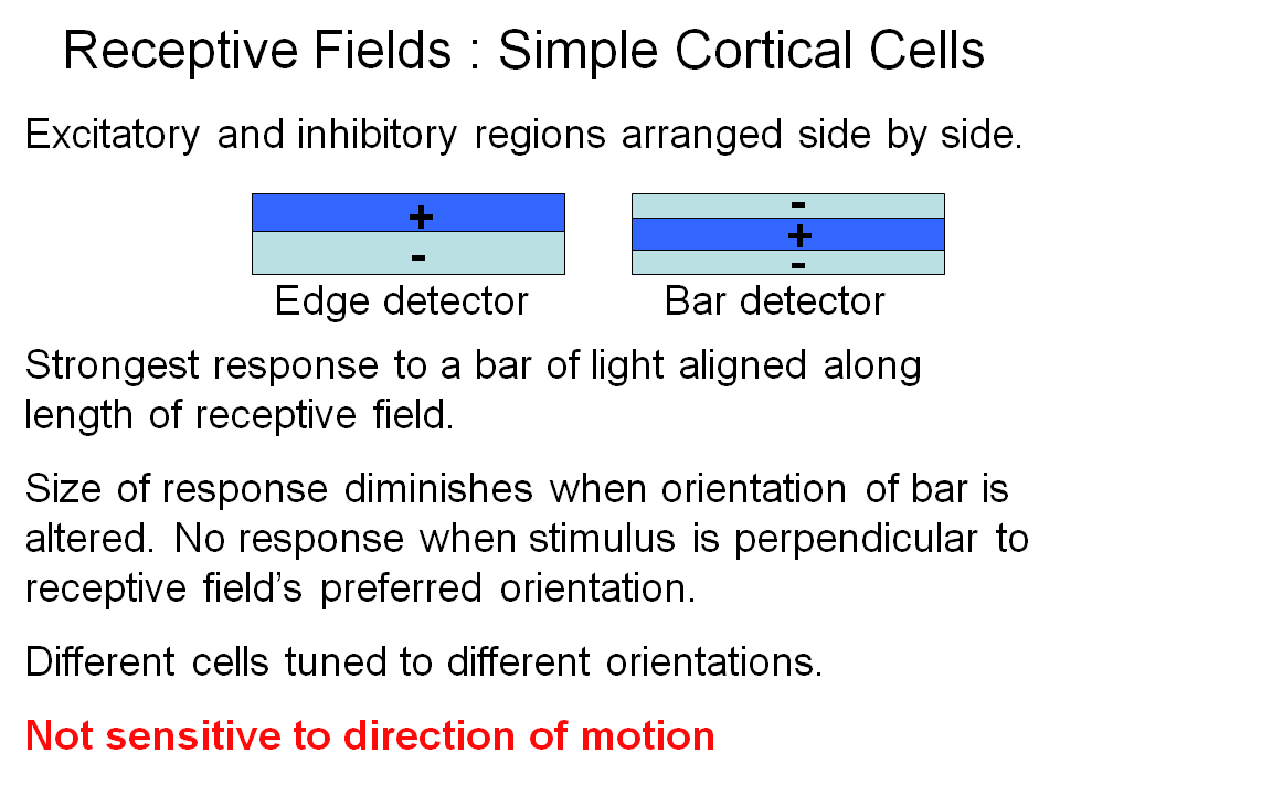 Complex cells respond to gratings and edges of a particular orientation, but may also respond to moving stimuli.