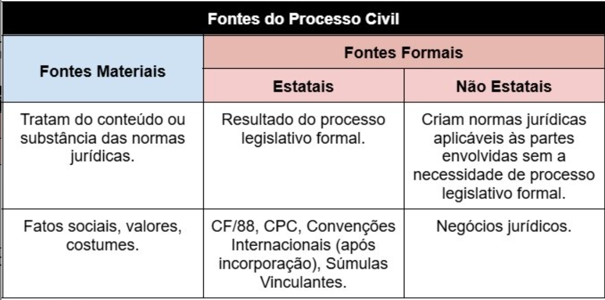🤓 O Código de Processo Civil não é uma fonte material, mas uma fonte formal estatal legislativa. As fontes materiais são aquelas que tratam do conteúdo ou substância das normas jurídicas, como os fatos sociais que dão origem às leis.