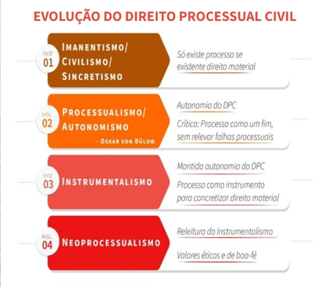 1ª SINCRETISTA OU PRAXISTA: Não há distinção científica entre Direito Material e Direito Processual. Também chamado de empirismo processual, fase em que o processo era visto como um conjunto de atos destinados a garantir a aplicação do direito material. Não havia uma preocupação sistemática com a autonomia do processo como ciência jurídica.