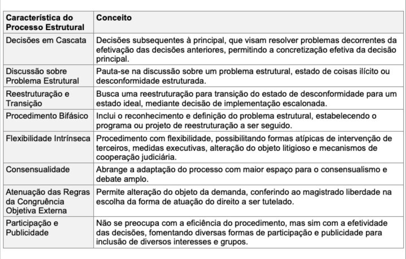 🥠 Explicação: O processo estrutural é usado para resolver problemas complexos e coletivos, geralmente ligados a políticas públicas (como saúde, educação, sistema prisional, meio ambiente etc.).