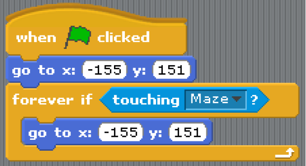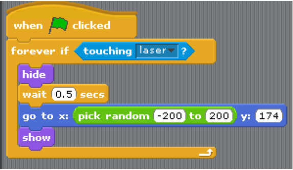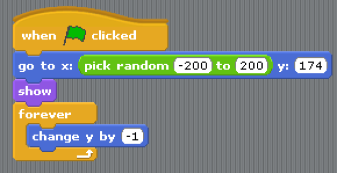 When the green flag is clicked, the program picks a random place at the top of the screen. The alien is then shown. A loop forever command makes the alien automatically move down the screen.