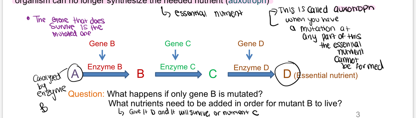 - mutating a gene encoding an enzyme would cause a block in the metabolic pathway and the organism can no longer synthesize the needed nutrient (auxotroph)