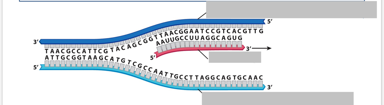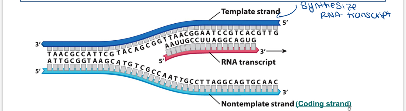 - the other DNA strand is the non template strand or coding strand (has same 5’to3’ orientation and sequence as mRNA molecules except uracil is substituted with thymine