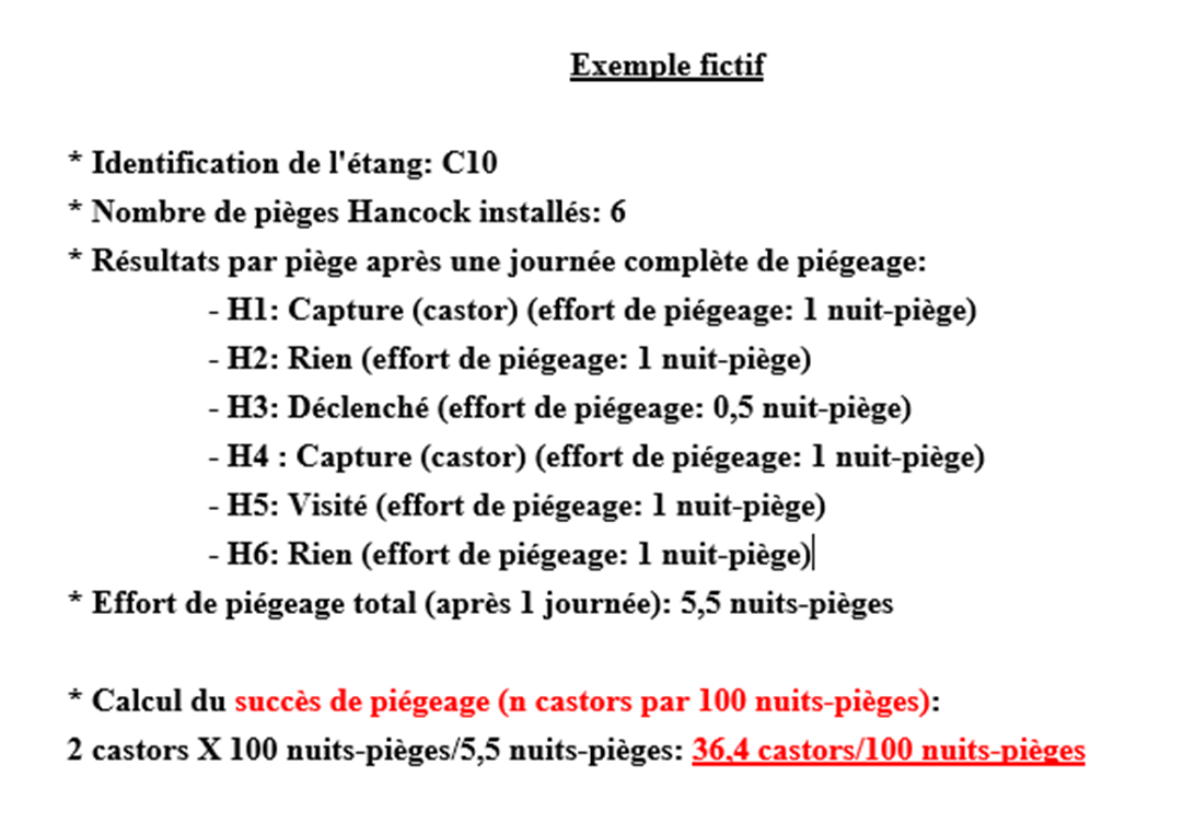 Le seul piège qui sera utilisé pour capturer les castors est le Hancock. Il est composé de deux grillages concaves au centre duquel se trouve un déclencheur. On écarte les volets de manière qu’ils forment un angle de 120° et on arme le piège (suivant la procédure décrite dans le document spécifié à l’annexe 6). Un des volets du piège est ensuite attaché à un pieu tandis que l’autre est immergé sous quelques pouces d’eau. Un appât, quelques petites branches de trembles ou de bouleaux, est placé à travers le grillage du volet attaché au pieu, vis-à-vis du déclencheur. Le reste du feuillage devra être parfaitement camouflé avec des herbacées (foin sec, macrophytes aquatiques, etc.) Le castor en s’approchant actionne le déclencheur et le piège se referme sur lui-même, emprisonnant ainsi l’animal.