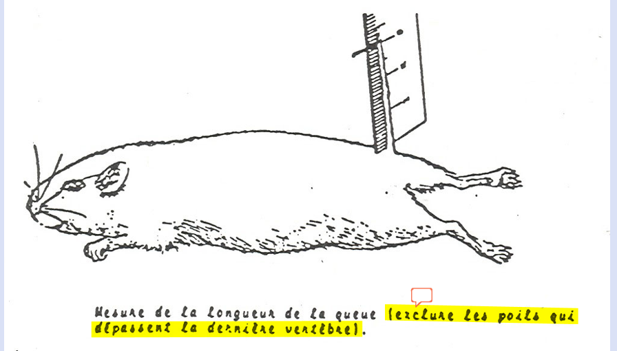 -10: Évaluer l’état de l’animal tout au long de son anesthésie (rythme de la respiration, présence de convulsions etc.) Il est important de manipuler l’animal sans gestes brusques et de parler à voix basse; -11 : Mettre l'étiquette métallique à l'oreille gauche de l’hermine ou de la belette. Noter son numéro. Attention : Désinfection nécessaire et ajout de l’onguent antibiotique (réf. p. 15_Protocoles castor et lièvre 2025; section sur le castor); -12: Mesurer la longueur totale, la circonférence du cou, la longueur de la queue et la circonférence de sa poitrine; -13: Déterminer le sexe en vérifiant la présence du baculum (par palpation) ou des testicules chez le mâle (les testicules seront possiblement visibles étant donné que la période de trappe coïncide avec la fin de la période de reproduction de l’hermine et de la belette à longue queue) ou de la vulve chez la femelle; -14: Noter toutes les informations supplémentaires qui vous semblent pertinentes dans la section "remarque" du formulaire de terrain; -15: Une fois toutes les mesures effectuées, remettre l’hermine ou la belette dans la cage à l’ombre avec un petit morceau de tissu humidifié qui recouvrira ses yeux. Des personnes seront mandatées pour observer l’animal pendant son réveil afin de constater son état; -16: Relâcher l'animal au point de capture seulement lorsque celui-ci aura repris tous ses sens; -17: Réinstaller et réappâter le piège.