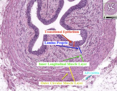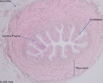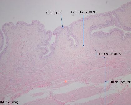 Highly convoluted mucosa Urothelium with multiple layers (3-6) Dense, vascularised lamina propria Muscularis Adventitia